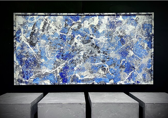 SAGA サンライズパーク SAGAアクア のアリーナに展示されているタペストリー型の作品の直筆の生作品を展示します。地球と宇宙をイメージし、「青い」と文字を書いた壮大な世界観の作品です。