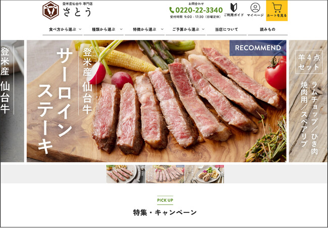 ECサイト「登米産仙台牛専門店さとう」では、食べ方(ステーキ、焼肉、すき焼きなど)、特徴(赤身中心、分厚い、希少部位など)、ご予算から商品を選択することができ、お客様が利用しやすい構成になっています。