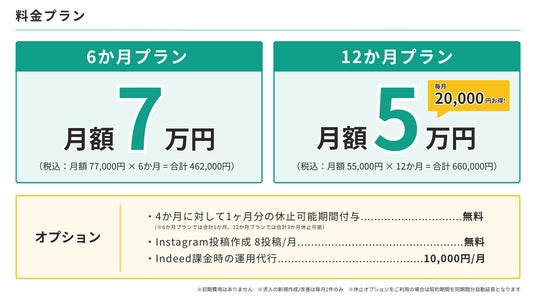 また、採用活動を一時停止させたい時に無料で支援を停止できるオプションや、スカウト送付が不要になった際にInstagram運用に切り替えられるオプションをご用意し、各社の採用状況に合わせた柔軟なご支援を提供できるサービス内容となっております。