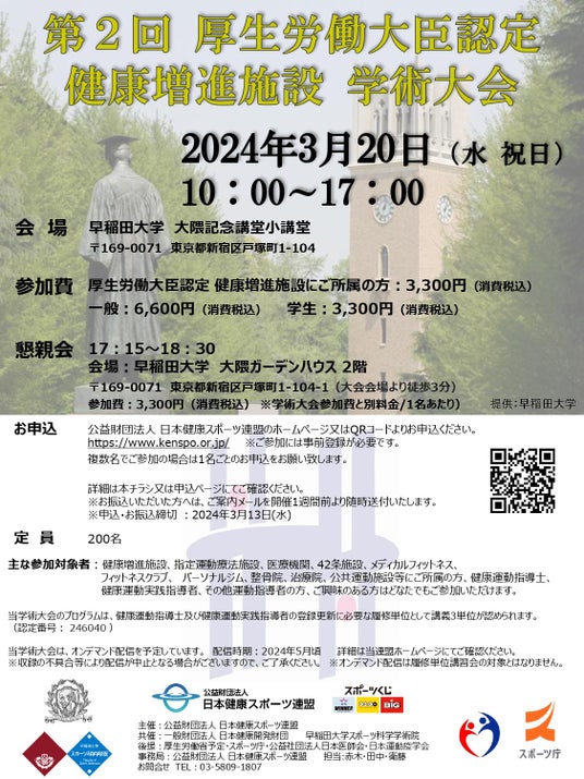 公益財団法人日本健康スポーツ連盟は、3月20日(水・祝)、健康増進施設・指定運動療法施設のさらなる普及を目指し「第2回厚生労働大臣認定 健康増進施設学術大会」を、早稲田大学大隈記念講堂小講堂にて開催いたします。
