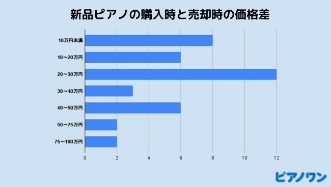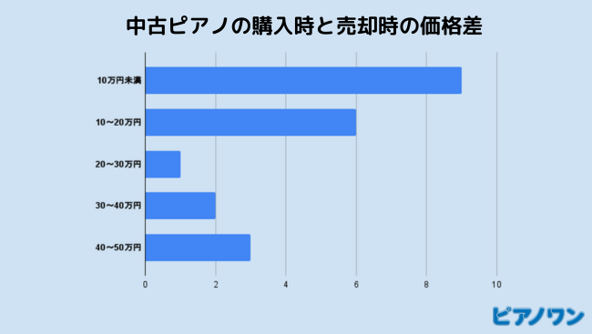アップライトピアノ(グランドピアノ、電子ピアノは除く)の購入時と売却時の価格差は、10万円未満が17票、10~20万円が12票、20~30万円が13票、30~40万円が5票、40万~50万円が9票、50万円以上が4票となりました。