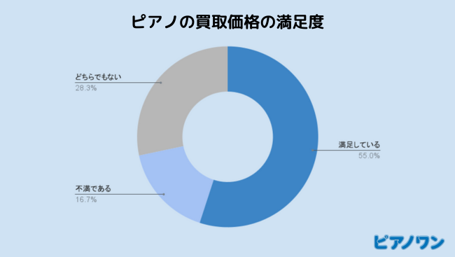 ピアノの買取価格の満足度は、満足しているが33票、どちらでもないが17票、不満であるが10票となりました。