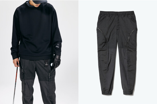 裾をゴムで軽く絞ったジョガータイプのパンツ。表地は、ウォッシャブル・防シワ・軽量の機能を備えた3種類のストライプ地を組み合わせたフラグメントデザインで、裏地には保湿性の高いフリースを使用。左右のカーゴポケットにはティーやボールを入れることができ、右後ろには距離計が収納できるマジックテープ仕様のポケットがついています。¥42,900 tax in