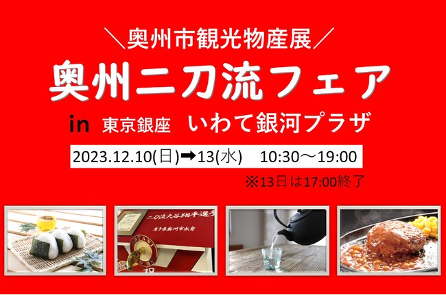 岩手県奥州市は、2023年12月10日(日)から12月13日(水)まで銀座にある岩手県アンテナショップ「いわて銀河プラザ」にて観光物産展「奥州二刀流フェア」を開催いたします。