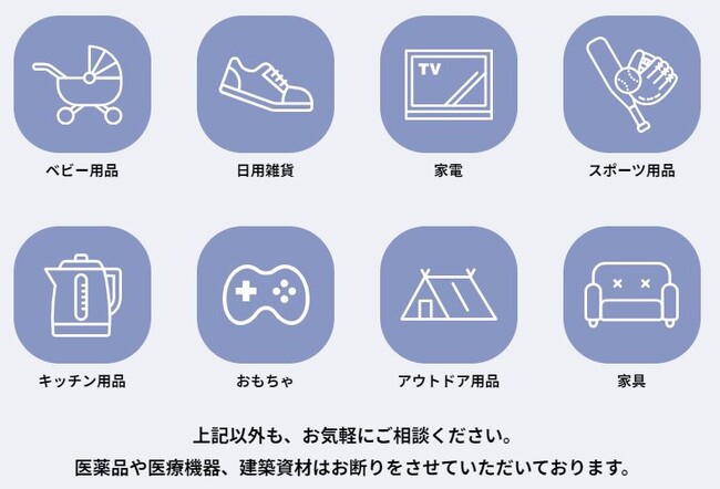 買取可能な商品は「医薬品」「食料品」「建築資材などのBtoB向け商品」を除くほとんどあらゆる商品でございます。