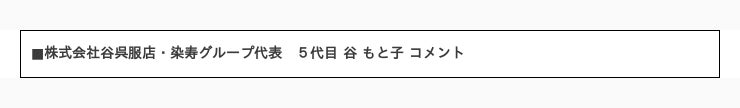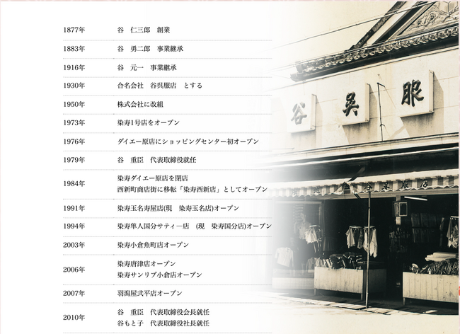 1877年(明治10年創業)/1930年合名会社 谷呉服店に /1950年株式会社に改組/1979年 4代目 谷 重巨 代表取締役就任/2010年 5代目 谷もと子 代表取締役社長就任