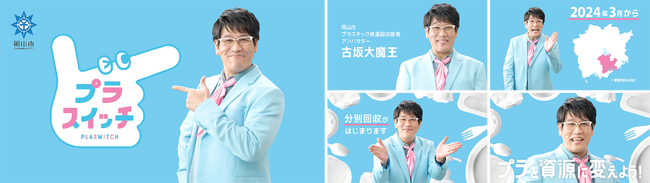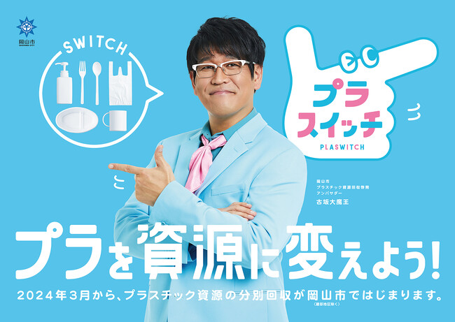 岡山市では、2024年3月から開始するプラスチック資源の分別回収に向け、周知啓発キャンペーン「プラスイッチ」を2023年10月20日リサイクルの日(※1)から開始します。啓発キャンペーンのアンバサダーには、お笑い芸人の古坂大魔王さんに就任いただきましたのでお知らせいたします。