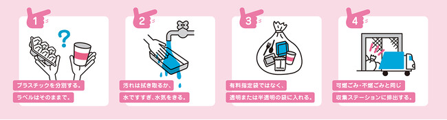 排出方法:「プラスチック資源」の排出は、透明または中身の見える半透明の袋を使用してください。汚れは拭き取るか、水ですすぎ、水気を切ってください。ラベルはそのままで大丈夫です。