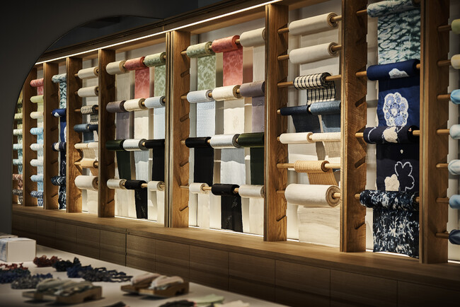 <ANDO>, the Hands-On Experience Shop is not a place that merely displays products. We have aimed to show eye-catching, overwhelming displays as a space that can provide visitors with fresh surprises and feelings. On the wall in front of the entrance, you can see a wall-mounted display that utilizes rolls of tanmono cloth. We have adopted a kind of display that lets visitors enjoy the techniques and thoughts of ANDO as an installed display.