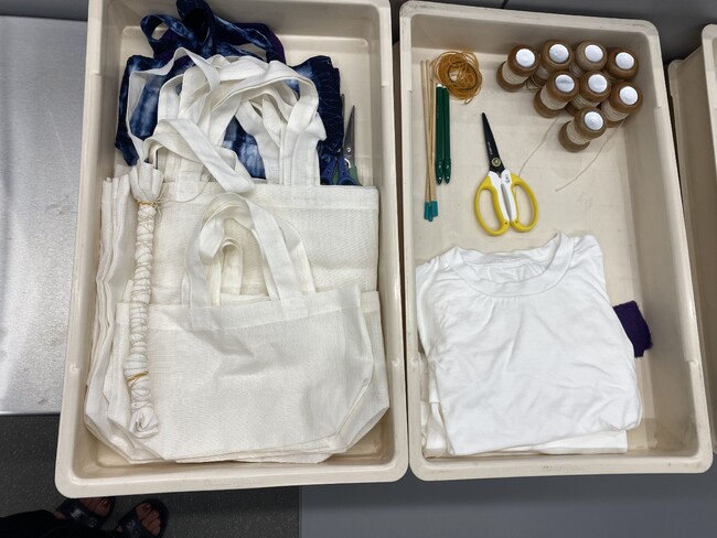 In the studio separated by glass next to the shop, visitors can actually experience dyeing. You can also observe participants enjoying themselves making their own dyes. In the future, we plan on using this space to hold workshops in which everyday people can participate. We have prepared hands-on experience programs for tie-dyeing handkerchiefs, tote bags, and t-shirts so that participants can experience creating things with their own hands, which is the starting point of creation. The work is not difficult and can be experienced in simple steps, but each item will have a completely different finish depending on the level of force and how much it is soaked. Experience the surprise at seeing a finish you did not expect when undoing and spreading open the tied threads. Because the process is simple, participants can utilize different ideas in this workshop. Through this workshop, we deliver the joy and possibilities of making things.