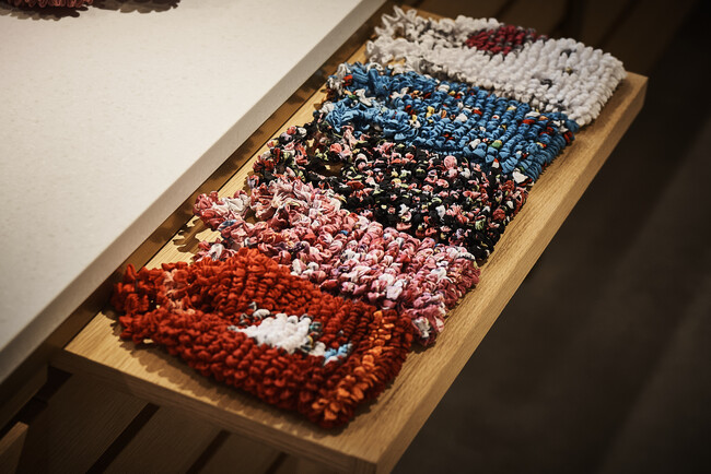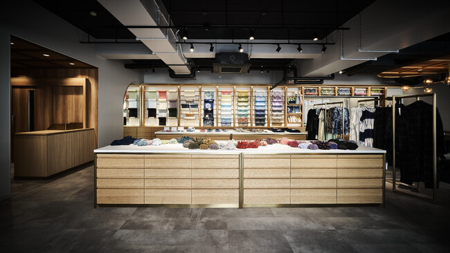 The Hands-On Experience Concept Shop has a space where business discussions and workshops can be held. In this space, we have adopted a ceiling and table based on the image of a cocoon. In addition, we have prepared materials such as publications related to tie-dyed fabrics, dyeing, culture, and manufacturing. We have aimed to create an environment in which ideas can easily come to mind when visitors come to the shop and see the many products with their own eyes, hold them, directly feel the colors and textures, and wonder what can be made. Through idea generation and research with designers and creators, and workshops with students and everyday people, we aim for this space to become an installation lab for tie-dyeing and dyeing in which new exchanges between techniques, people and ideas can be born.