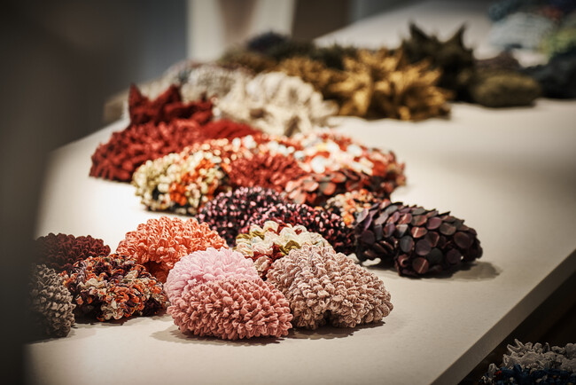 By systematically and dynamically displaying our tie-dyed products at the exhibition stands in the shop, we have come up with a way of conveying the features unique to tie-dyeing. We show visitors the techniques behind tie-dyed fabrics and dyeing in a visual and tactile manner. We imagine visitors being excited at what they see, wanting to hold the items themselves, and having lively conversations.