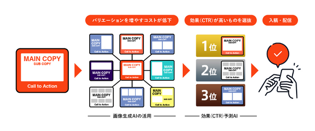 生成AIを活用することで得られるメリットの一つとして、低コストで多くのバリエーションを制作できる点が挙げられます。これにより、多くのバリエーションのなかから、効果が見込まれるクリエイティブデザインを選抜していく、という制作フローが可能になります。そこで、Re Data Scienceではオプトと共同で「多数の広告クリエイティブデザインのなかから、広告効果(CTR)の良いデザインを選抜する」するための予測AIツールを開発いたしました(近日ローンチ予定)。 選抜されたクリエイティブデザインのみを入稿・配信することで、広告効果(CTR)を安定的に向上させることができます。