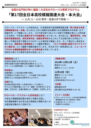 日本中の高校生たちによる模擬国連が、今年も盛大に開催されます。一般社団法人グローバル・クラスルーム日本協会(本社:東京都港区)は、第17回全日本高校模擬国連大会・本大会を、2023年11月11日(土)から12日(日)にかけて開催します。この模擬国連大会は、国際問題への理解と討議能力を高め、将来の国際社会での貢献を支援する重要なイベントとなっています。