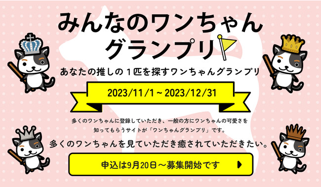 「みんなのワンちゃんグランプリ」「みんなのねこちゃんグランプリ」は、全国のワンちゃんねこちゃんにエントリーしていただき、期間限定で人気順位を競う参加型イベントサイトです。