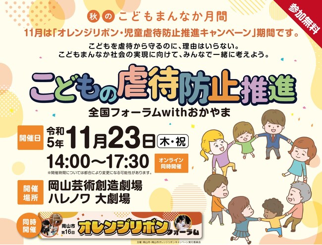 こども家庭庁では、2023年11月23日(木・祝)に「こどもの虐待防止推進全国フォーラム with おかやま」を岡山市の岡山芸術創造劇場ハレノワで開催します。