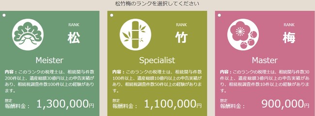 当サイトでは、遺産総額と税理士の経験や実績、専門性などに応じたランク(松・竹・梅)で表示される報酬額は明瞭であり、相続案件の内容等による追加料金は一切ありません。
