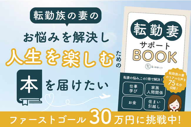 kinocomでは、当事者であるメンバーの経験をもとに制作した本書をより多くの人に届けることで、孤独な悩みから解放され人生を楽しめる転勤族の妻を増やすため、11月22日(水)21:30~クラウドファンディングを開始します。募集期間は12月15日(金)まで、募集金額は30万円を目指します。