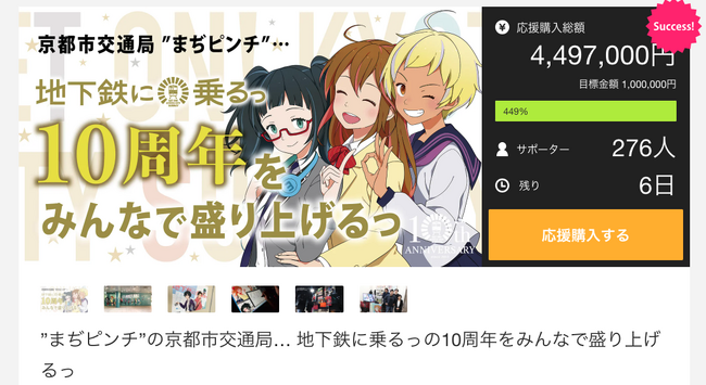 10周年を迎えた京都の地下鉄PRコンテンツ「地下鉄に乗るっ」のクラウドファンディングに約450万円の支援が集まり、話題となっています。