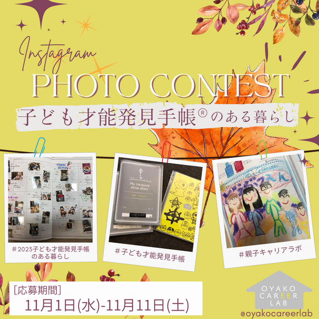 親子キャリアラボ(本社:広島県広島市中区八丁堀)は子どもの才能や個性を書き残す【子ども才能発見手帳】の魅力や手帳とともにある暮らしをより多くの方に知っていただくため、「子ども才能発見手帳(R)︎のある暮らしフォトコンテスト2023」を、2023年11月1日(水)~11月11日(土)の期間、Instagram(@kodomo_sainouhakken_techo)にて開催いたします。