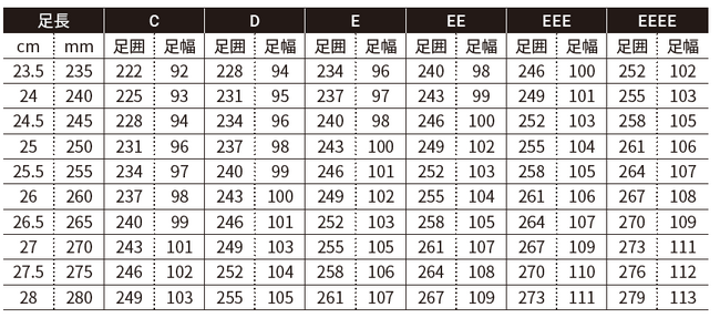 サイズ(足長):23.5 - 28cm(0.5cm 刻みの10 サイズ)