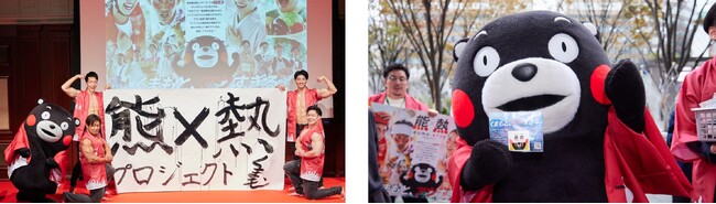 当日は、熊本県営業部長兼しあわせ部長の「くまモン」が登場し、本プロジェクトのコンセプトを書道パフォーマンスで披露したほか、”アツ”苦しいマッチョ集団も応援に駆け付け“アツい熊本”をPRしました。展開予定の「熊×熱プロジェクト」の詳細についても発表があり、今後も更に”アツい熊本県”への期待が高まりました。また、発表会終了後は博多駅博多口にて、「くまモン」や「くまモン隊」が、寒くなる冬に向けて体を”アッ”たかくしてくれるカイロやプロジェクトオリジナルステッカーなどを配布するサンプリングイベントを行い、「熊×熱プロジェクト」を一般の方へPRしました。