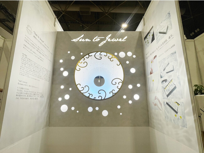 ブースは、サントジュエルのロゴフレームの中に日光があたり、キラキラと輝く海の中を表現し、奥行きのある他にはない神秘的なデザインで制作いたしました。