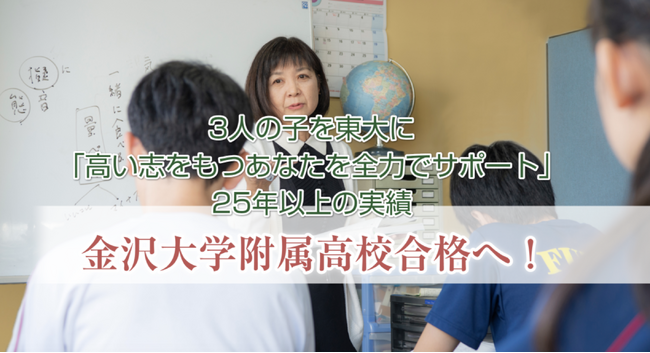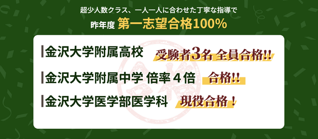 金沢大学附属高校推薦2名、泉丘理数科1名、附属中学・錦中学・附属小学校複式。全員合格。