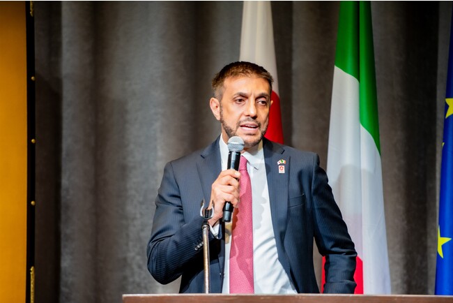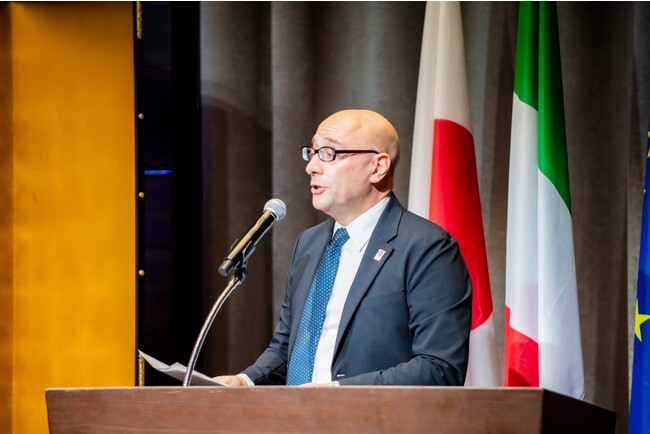 冒頭、マルコ・プレンチペ 在大阪イタリア総領事が、来賓と100名を超える来場者へ謝辞を述べ、イタリアパビリオンの発表会がスタートしました。