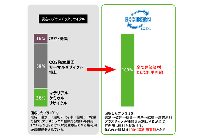 そこで私たちが開発したエコボーンは、フルリサイクル可能な建材を製造可能な新素材を開発しました。