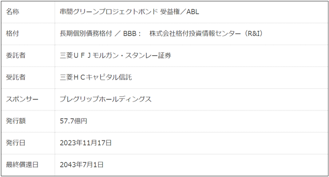 株式会社プレグリップホールディングス(本社:東京都中央区、代表取締役:野崎人孝、以下「当社」)は、グリーンプロジェクトボンド信託受益権/ABL(総額 約58 億円)を当社がスポンサーを務める発電事業者 SPCを通じて発行いたしましたので、お知らせいたします。本件は、当社グループが開発する宮崎県串間市及び鹿児島県志布志市に位置する太陽光発電事業を裏付けとした開発型プロジェクトファイナンスです。