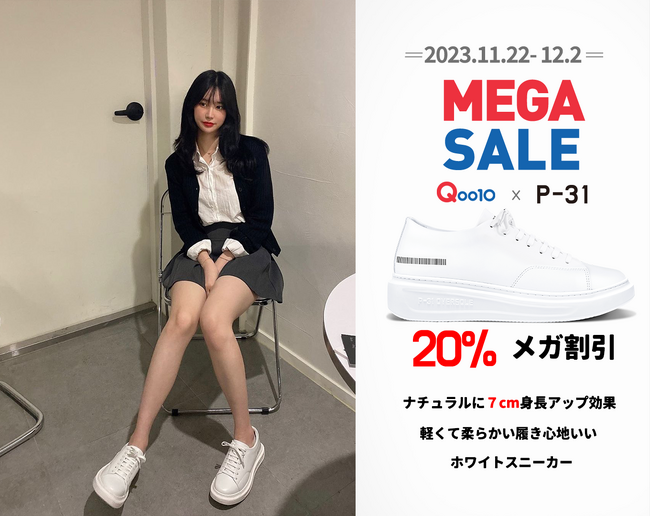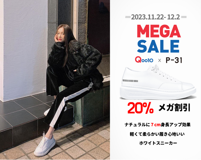 スニーカーブランド『P-31』では、人気商品が最大20%OFFされる「Qoo10メガ割」に参加します。