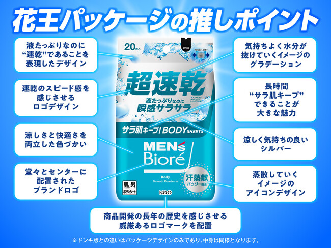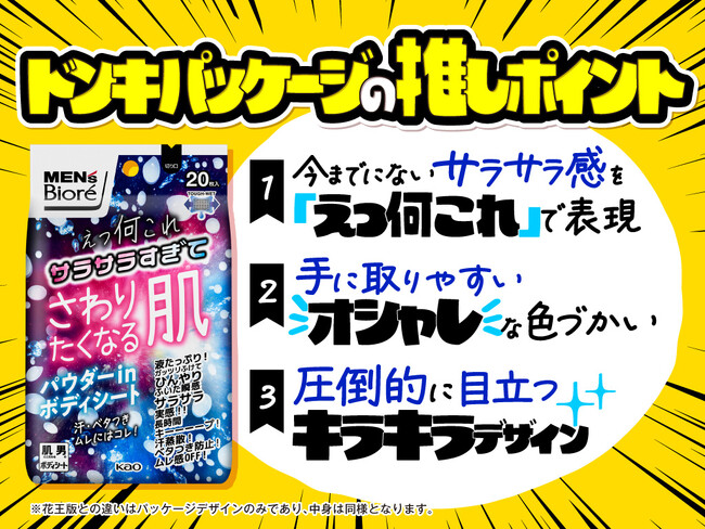 “顧客最優先主義”を掲げる株式会社ドン・キホーテ(以下、ドン・キホーテ)と、花王株式会社(以下、花王)の男性用スキンケアブランド『メンズビオレ』は、双方の知見を最大限に活かし、ドン・キホーテにご来店されるお客様が手に取りたいと思っていただけるボディシートをめざして、『メンズビオレ ボディシート さらさらタイプ』のパッケージを2社がそれぞれ制作し、同時に発売をいたします。