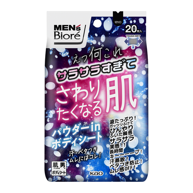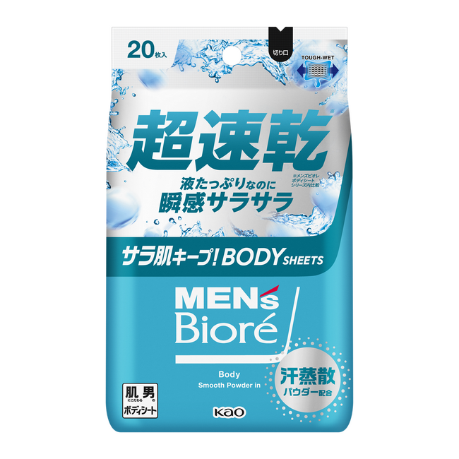 花王『メンズビオレ』は、男性の肌を考えたスキンケアブランドとして、これまで多くの方々にご愛用いただいています。今回の『メンズビオレ ボディシート さらさらタイプ』は、「液たっぷりなのに瞬時にサラサラ感を実感でき、かつ、長時間サラサラな肌がつづく」ことが特長です。