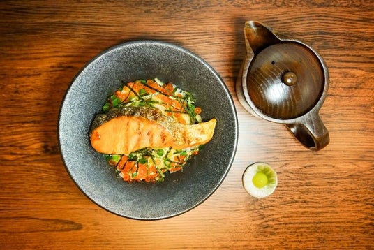親子茶漬け 1,100円看板メニューの鮭の切り身丸ごと1個といくらがのっている、鰹と昆布だしで食べる贅沢茶漬け