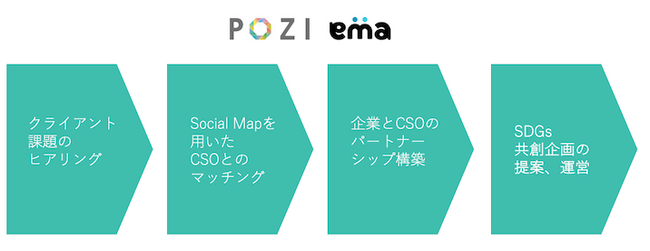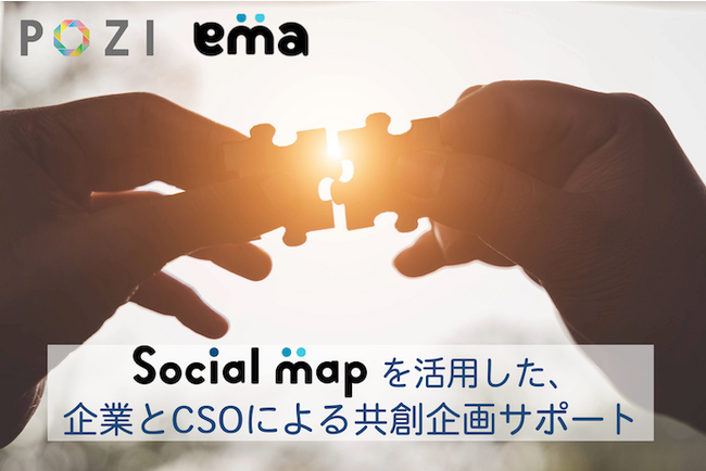 株式会社EMA(代表取締役 楯晃次、東京都渋谷区、以下「EMA」)と株式会社東急エージェンシー(代表取締役社長執行役員 高坂俊之、東京都港区)の SDGs プランニング・ユニット「POZI」(以下「POZI」 https://pozi.jp)は、EMAが開発・運営する「Social map」を活用した、企業とCSOのマッチングからパートナーシップの構築、そして共創プロジェクトの企画、提案から運営までをワンストップで、トータルにサポートするサービスを提供します。