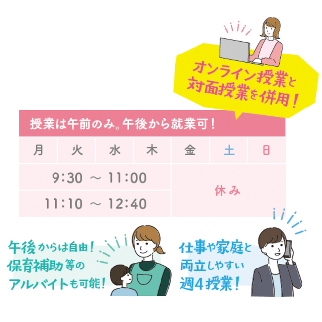 卒業と同時に「保育士資格」を取得!2年制で必須授業は週4日・午前中のみ!対面×オンラインの併用が可能