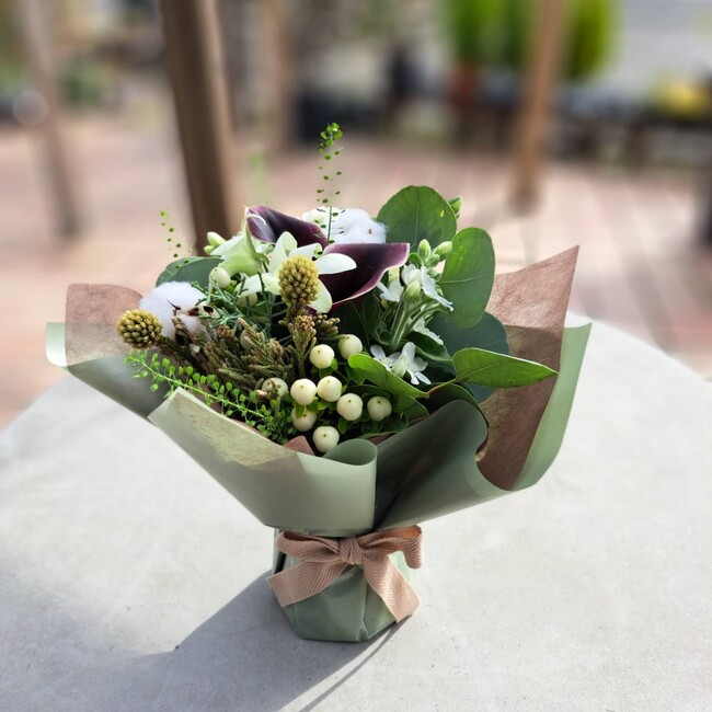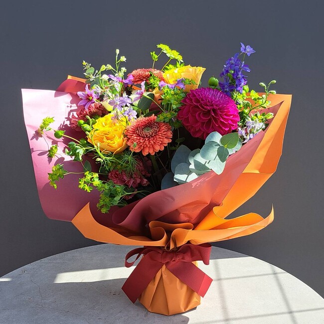 季節のお花を使ったフレッシュな自立するタイプのブーケです。ラッピングの中に専用カップがついており、保水してあるので長時間の持ち歩きにも最適です。またラッピングしたまま飾ることができ、贈る相手が花瓶を持っているかを心配する必要もありません。