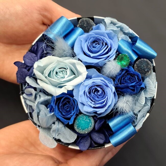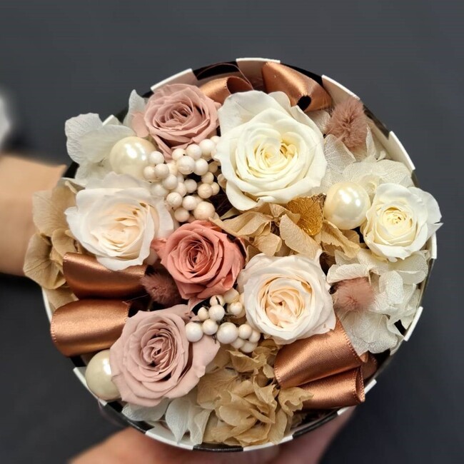 プリザーブドフラワーをサークルボックスにアレンジしました。蓋つきなのでサプライズギフトにも人気です。