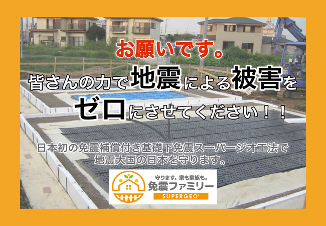 弊社では、「プラごみで創る。住宅防災プロジェクト」【https://supergeo-pj.com/】をを展開しています。私たちは住宅防災プロジェクトの一環として、スーパージオ工法(地震から大切な家や家族を守る新・免震工法)をより多くの皆様に知っていただき、スーパージオ工法を採用して下さった方々を免震ファミリーと称して、皆さまと一緒に地震大国である日本を支えていきたいと考えております。
