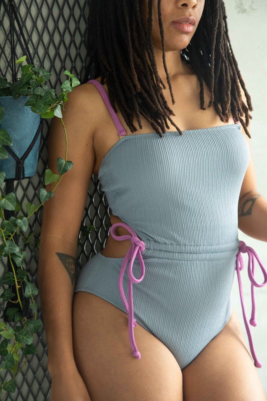 正面から見ると露出がないデザインとなっていますが、後ろから見るとセパレートのスイ ムウェアにも見えるこだわりのデザインとなっています。サイドのカッティングと調節可 能なウェストリボンでスタイルアップ効果があり自然に美しいシルエットを演出するた め、カラースイムウェアに抵抗がある方でも楽しめるシリーズです。ショートパンツやデ ニムなどと合わせて普段使いとしてもおすすめです。