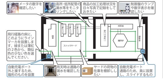 図にあるように、メータの確認や漏水の確認、日々の状態の記録、荷物についているQRコードの確認など、点検業務や撮影業務、棚卸業務などのシーンに利用ができます。この図はドローンを2台導入し、1台が故障しても業務が続けられるよう、設置している例です。飛行場所の通路は70cm以上の幅と、70cm~3.5mの高度が必要です。
