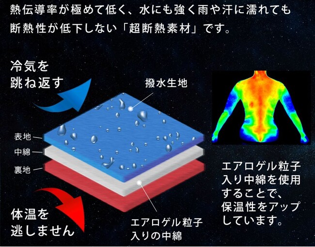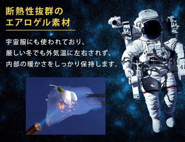 エアロゲル素材は宇宙服にも使われている最先端技術を駆使したハイテク素材です。厳しい冬でも外気温に左右されず、内部の暖かさをしっかり保持することから「超断熱素材」とも言われています。