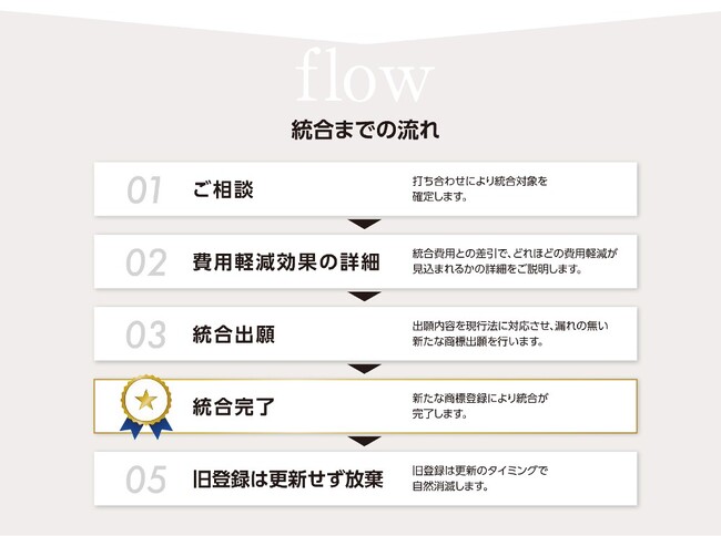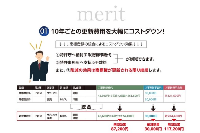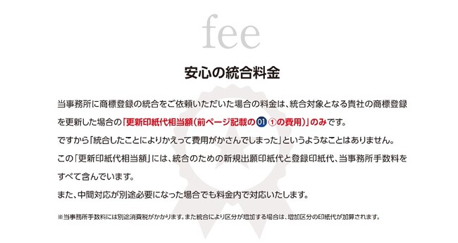 同一の商標について複数の商標登録を保有されている企業様に対し、更新印紙代相当額で統合出願を行い、商標権維持コストと権利管理負担の削減を実現します。
