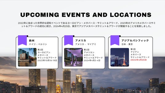 CEE Business Media は、欧州を中心に10年以上にわたり表彰イベントを開催している企業です。メタバース分野においては、2022年にドイツのベルリンで開催されたヨーロッパメタバースサミット&アワードを皮切りに、アメリカのマイアミでも同様のイベントが開催され、これが世界的な認知を集めるきっかけとなりました。欧米での成功を経て、2024年4月25日には日本の東京でアジア メタバース サミット & アワードを開催できることを大変嬉しく思います。