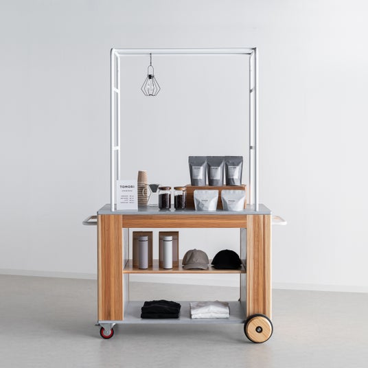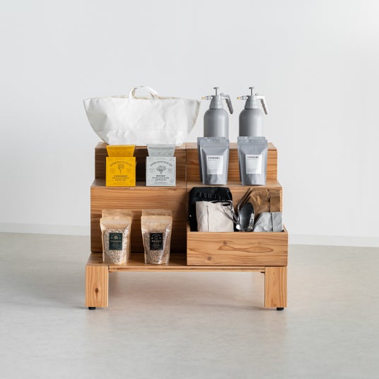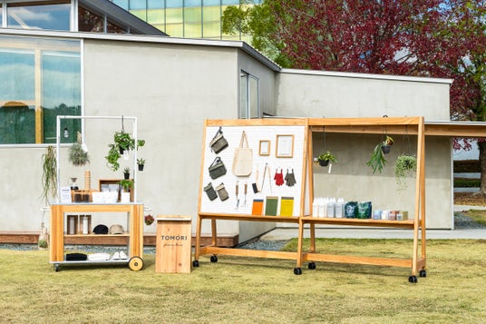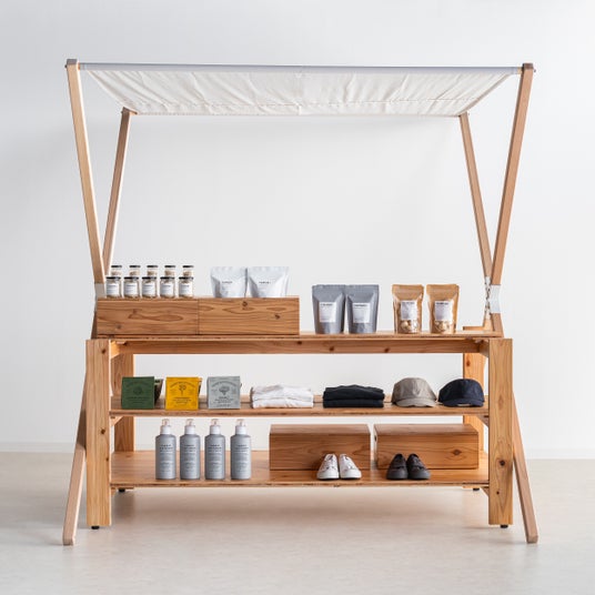 「TOMORI」は移動できるリヤカー型什器WATAIシリーズに簡易タイプのテントやワゴンなど新商品を加え、屋外イベントや店舗などで活用できる組み立て式の店舗什器、イベントなどでのコンテンツとなる国産木材を活用したワークショップキットなど全30アイテムを展開します。