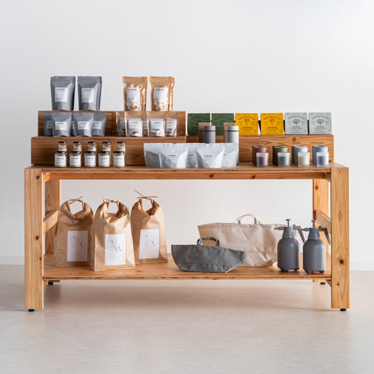 ディスプレイテーブル、サインなどマーケットイベントやショップなどのディスプレイ什器に欠かせないアイテムを揃えています。すべて国産杉を使ったインテリアCLTを使用しています。