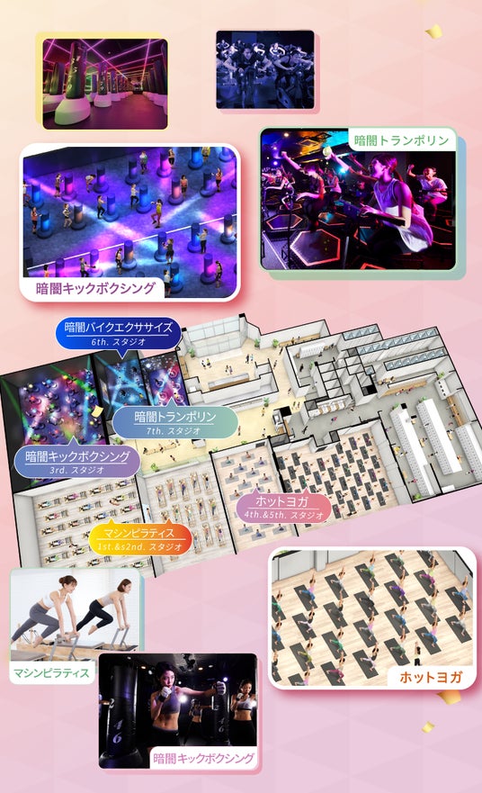 LAVA史上初の超大型複合施設には、ホットヨガ「LAVA」が2スタジオ、マシンピラティス「Rintosull」が2スタジオ、暗闇キックボクシングの「BurnesStyle」が1スタジオ、暗闇トランポリンの「jump one」が1スタジオ、バイクエクササイズの「FEELCYCLE」が1スタジオの計7スタジオ完備しており、5ブランドの通い放題が可能となります。