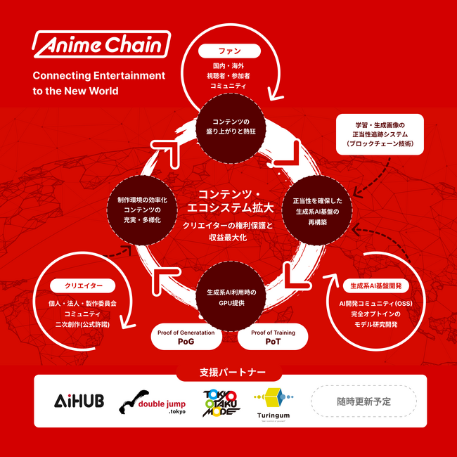 本日、国内のAI/ブロックチェーン有識者らは、「アニメチェーン」準備委員会を設立し、現在の生成系AIにまつわる著作権や倫理的問題について、基盤モデルを含むすべての学習をブロックチェーン技術を用いて正当性を担保したオプトインのデータセットのみで行う生成系AIを提供し、コンテンツ・エコシステムのさらなる拡大のため、従来中心だった欧米・アジアに加え、中東・アフリカなども含めたグローバルな展開を目指す「アニメチェーン構想」を発表しました。本構想の実現により、クリエイターや企業が著作権や倫理的問題を気にすることなく、安心・安全に生成系AIを活用できる制作環境の整備を目指します。また、産業全体の課題となっているアニメ制作現場の”人手不足”の解決も図って参ります。