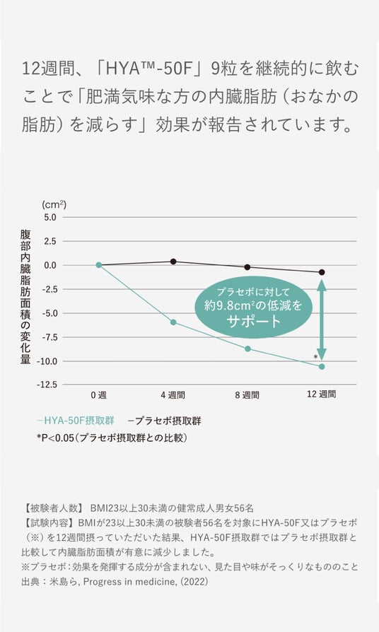 *3 12週間、「HYA(TM)-50F」9粒を継続的に飲むことで肥満気味な方の内臓脂肪(おなかの脂肪)の面積を減らす機能があります。